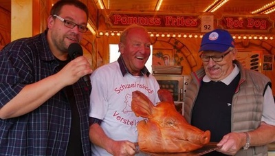 Danach legt Andreas Decker als Versteigerer los und versucht mit markigen Sprüchen, den Leuten die Münzen aus der Tasche zu ziehen. Neben den Schweinsköpfen wird seit einigen Jahren auch ein ganzes Schwein versteigert. Hinzu kommt noch ein Schinken.